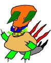 Arms, Legs & Body - The body is peanut shaped One part of the peanut holds the arms and the other holds the legs. The whole peanut body is 2 1/2 inches long. In the muddle of the body it becomes skinny. He wears a belt with a dagger. There's a big black spike on his back. There are two long arms near the chest. One arm goes down and bends up to the chest, like a V. The part going down is two inches in length and is 1/2 inch in width. Its fingers are curled up with pointed nails. Both arms are very furry. The dagger it carries looks split apart, with spikes on it. Both legs are bent in a crouching position. The thighs are 3/4 inch wide and 1 1/2 inches long. The bye the knee there is a spike. Its feet look like they have birds talons, because they are so sharp. Each foot has two spikes on the front and one spike on the back. The length of the feet are one inch.