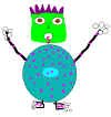My monsters name is Squiggle. He has a round, green face, with spiky, purple hair. The shape of his head resembles a pineapple. He has oval eyes, with LARGE, brown pupils. He has two short lines for a nose. His mouth is a little circle, with a short, squiggle, pink tongue sticking out of his mouth. His body is turquoise. He has purple polka dots all along his body, except on his head. He has an oval on his belly, which is light blue. Squiggle has long arms, with fingertips as round as balls. He has no legs, but he does have feet. His legs are attached to his body. The tips of his feet are round, too.