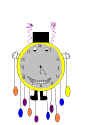 The Time Monster, by Rachel My monster is the Time Monster. It is a pocket-watch. First draw a circle and then another circle around it. Color in the small space between the two circles yellow - this is the rim. Then draw a small rectangle on top of the rim and color it black. In the big circle (the face), draw numbers around the edge, as a clock would have, in black. Then draw two ovals for eyes right below the spaces between the 11 and 12, and the 12 and the 1. At the bottom of the ovals, draw circles and color them black. Make a mouth stretching from the 5 to the 8 and put square teeth in it. Then put a dot in the middle of the face and draw clock hands coming out of it, making the time 6:05. Do this all in black. Next make hands (real ones) come out from the sides of the rim. On the right side, make a watch chain in a vertical oval that reaches from the 1 to the 5. Make that yellow. Color in the face light gray. Draw little black boots coming from the bottom of its rim. Also, make pendulums coming down from the bottom in orange, reddish-purple, blue, and purple. Make 9 in all. Then, as a final touch, make two zig-zags from the top of the rim and up in purple. Then add purple dots to the top of them.