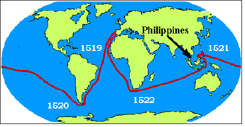 9. Magellan led an expedition around the world searching for a shorter sea route to the Indies. He was a Portuguese sailor who was sponsored by Spain. But he couldn't get Spanish sailors to go with him, because he was not Spanish. The king released criminals from jail to go with him! Magellan traveled west in 1519 to try to find a passage through South America, but he ended up going around the southern tip of the continent. He never completed the trip around the world himself, but 18 men in his crew of 250 did. Trace Magellan's route on the map below.